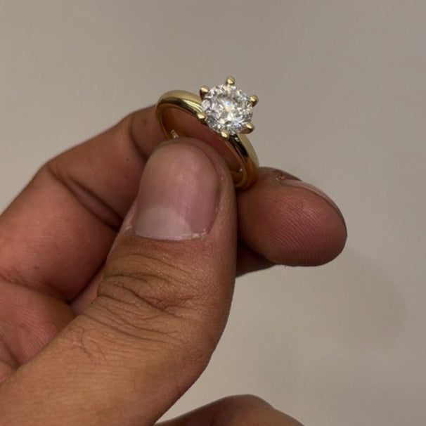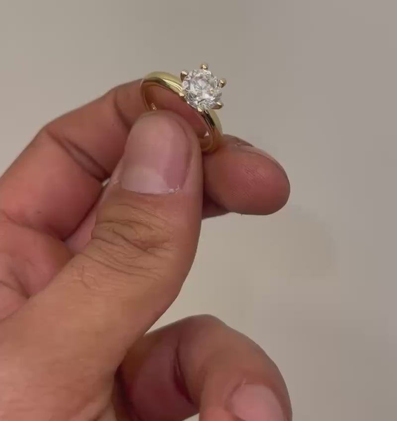 טבעת יהלום סוליטר מזהב צהוב 18 קראט היא תמצית הרומנטיקה הנצחית והפשטות החיננית. טבעת זה, העשויה בעבודת יד מזהב צהוב 18 קראט יוקרתי, מעוצבת בסגנון קלאסי וכוללת יהלום טבעי מבריק בחיתוך עגול במשקל מרשים של 1.50 קראט. היהלום, המשובץ במסגרת מאובטחת בעלת שש שיניים, מתנשא בגאווה מהטבעת, ומאפשר לאור מקסימלי להשתקף מכל פן ולהקרין את האש הטבעית שלו.