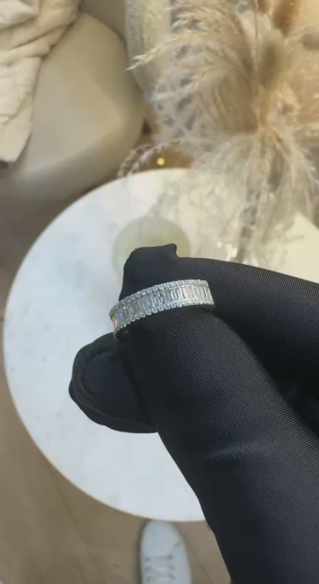 Crafted in luminous 14K white gold, this statement ring is adorned with an exquisite mix of 23 natural baguette-cut diamonds totaling 0.54 carats and 54 natural round brilliant diamonds totaling 0.22 carats. Each stone is meticulously selected for its VS clarity and D color, delivering a radiant symphony of sparkle and precision.